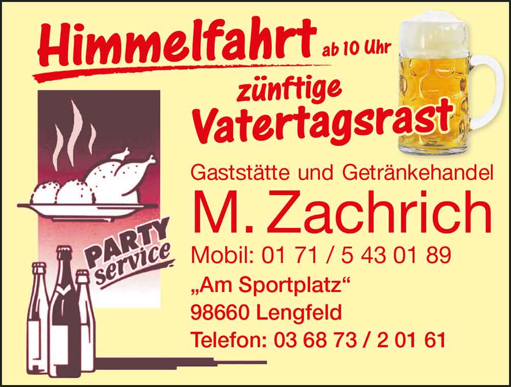 Weitersroda. Unser Männer-Vater-Christi-Himmelfahrtstag ist unserer Region gewidmet. Auf der Bühne stehen die Besten, die Südthüringen musikalisch zu bieten hat. Schön, zugegeben: Kleeberg kommen aus Würzburg, das nur mit sehr gutem Willen noch zu Südthüringen zu zählen ist…